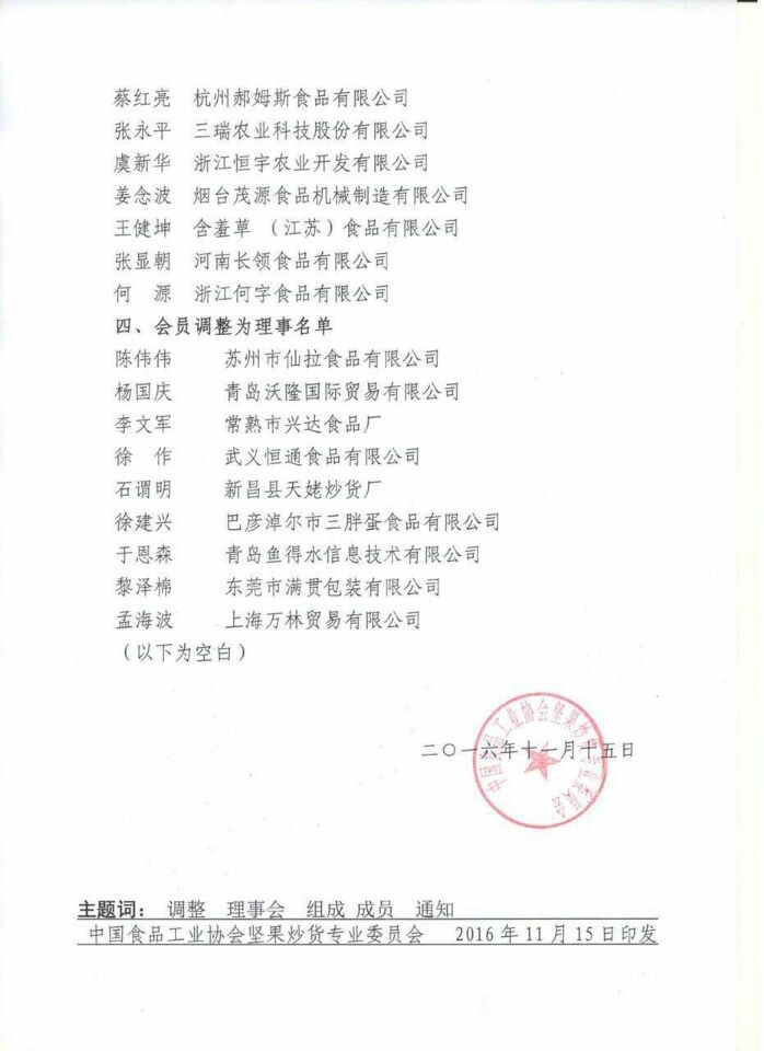 2016年11月15-16日,中國堅果協會年度理事會召開,中國堅果炒貨行業新的核心團隊誕生,全行業持續健康發展。我司總經理姜念波當選新一屆理事會常務理事。